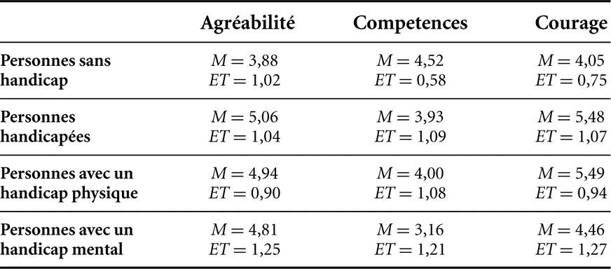 Plusieurs constats peuvent alors être dressés sur la base de ce tableau. D’abord, la moyenne d’agréabilité des personnes handicapées est jugée 30 % supérieure à celle des personnes sans handicap, 5,06 contre 3,88. La moyenne des compétences des personnes handicapées est jugée 15 % inférieure par rapport à celle des personnes sans handicap 3,93 contre 4,52. La moyenne du courage des personnes en situation de handicap est jugée 40 % supérieure à celle des personnes sans handicap. Les préjugés varient également selon le type de handicap. En effet, les personnes en situation de handicap mental sont jugées moins agréables (4,81 contre 4,94), moins compétents (3,16 contre 4) et moins courageuses (4,46 contre 5,49) que les personnes présentant un handicap physique. Par conséquent, si les préjugés dont les personnes en situation de handicap font l’objet en matière d’agréabilité et de courage sont globalement positifs, ceux en matière de compétence sont plutôt négatifs.